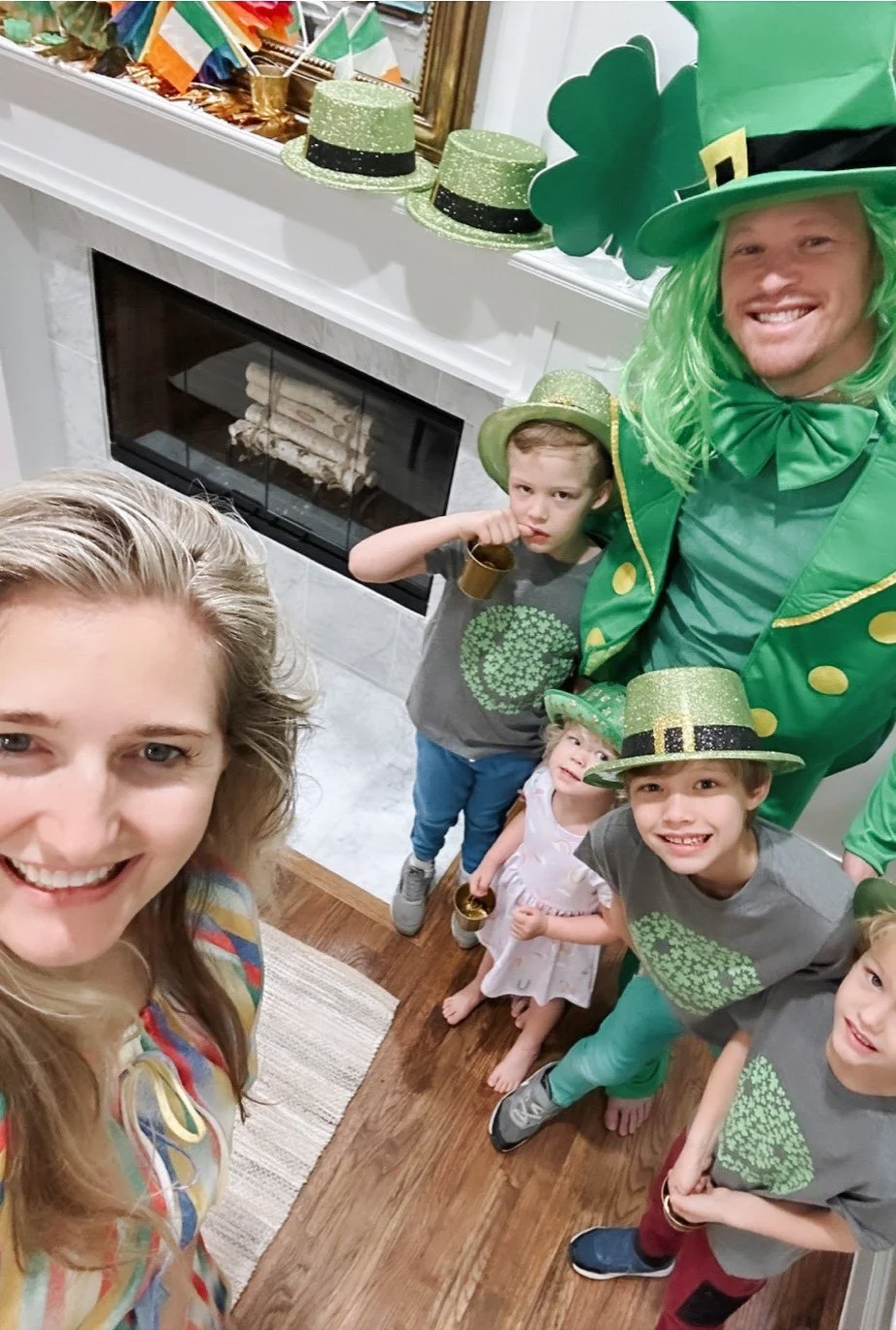 Holidays are all kinds of fun at our house as we’re always looking to celebrate the little joys in life! Whether it’s Valentines Day, Easter or St. Patricks Day, you can guarantee our home will be decorated for the occasion with festive pancakes on the menu. This St. Patricks Day, a “Leprechaun” paid a visit to our home while the kids were asleep and decorated our dining room. The kids were so excited when they woke up to see the house all decorated with rainbows, pots of gold and Tyson dressed up as a Leprechaun. For breakfast, we had green pancakes with rainbow sprinkles - a festive twist on their favorite breakfast!