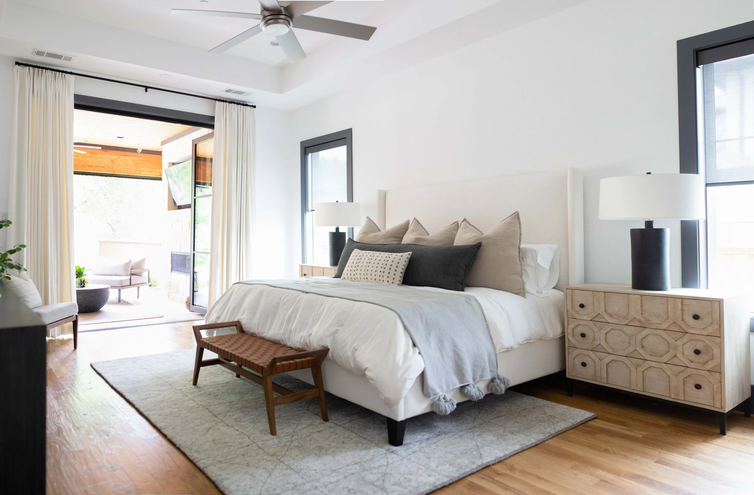 We’re back at our Colleyville Project revealing one of our favorite spaces from the home - the primary bedroom! Situated right off of the back patio, we absolutely love how the natural light pours into this bedroom through the glass doors that open up to the outdoors creating an indoor/outdoor living experience. That natural light bounces off the neutral palette of the space to create a cozy, light & airy oasis.