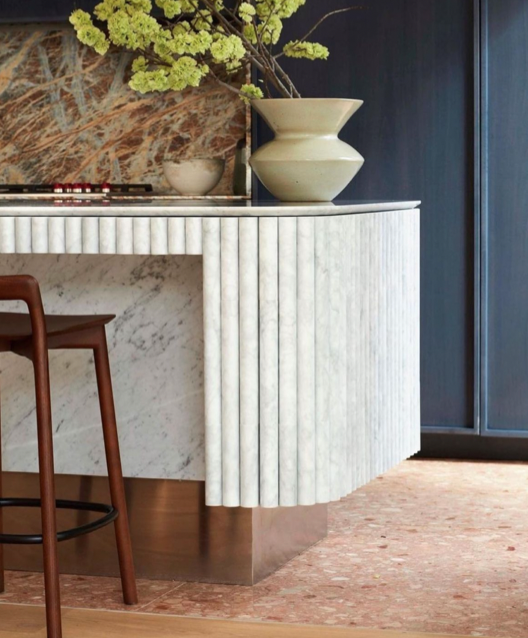 One of our favorite ways to execute this design trend in a kitchen is through cabinetry and millwork. In our kitchen remodel with Mindy McKnight, we designed a custom island with fluted cabinetry on the lower cabinets to add a pop of texture and make a statement as this is the focal point of the overall space. Over at our Drake Project (which is currently in the works), we will also be featuring a beautiful fluted detail on the kitchen island, however at this project, it will be carved into marble instead of wood. If you’re looking for some other ways to incorporate this detail into a kitchen space, we recommend adding it to a kitchen hood, to a pocket door that leads to a prep kitchen or pantry or installing fluted glass to cabinets with open glass doors.