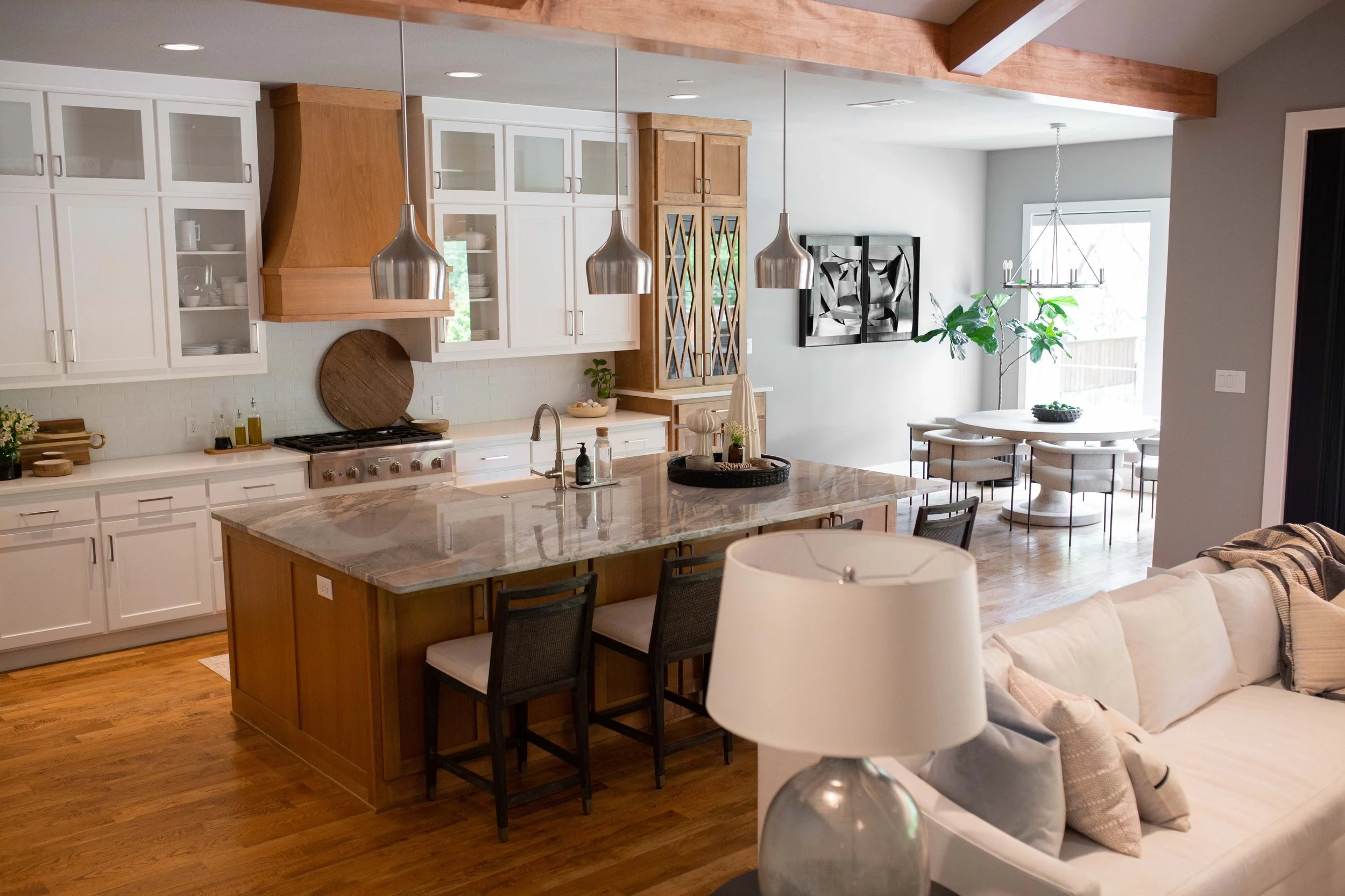 This week we are launching the Monroe Project. We are so excited to share this with y’all. We had such a wonderful experience designing for such a lovely family. The design aesthetic for this home is an elevated, New Traditional vibe. We loved accomplishing that style in this home and helping our clients bring this beautiful vision to life. The first space we are revealing is the heart of the home, the kitchen and dining nook. Of course this is one of our favorite spaces because this is where the family spends so much time in the home! Things we loved about this kitchen were bringing in furnishings and accessories to play off of the beautiful foundation that the home had to offer, such as mixed woods and painted cabinetry in the kitchen, beautiful countertops and exposed beams.