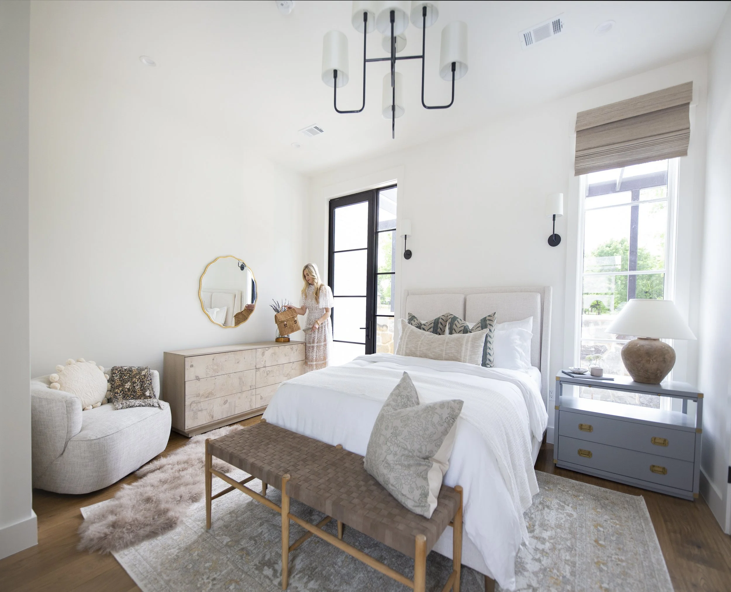 We love how charming this space is and having its own exterior door is a detail that we just can’t get enough of. We had fun with lots of natural light in this space and played off of that with the light colored furnishings. We also love the touches of black in the door, the light fixtures and hanging sconces over the bed that help ground the space and bring a mix of functionality and fun. Creating an airy, light and bright space is our natural design aesthetic and we loved incorporating that into this bright, feminine space.
