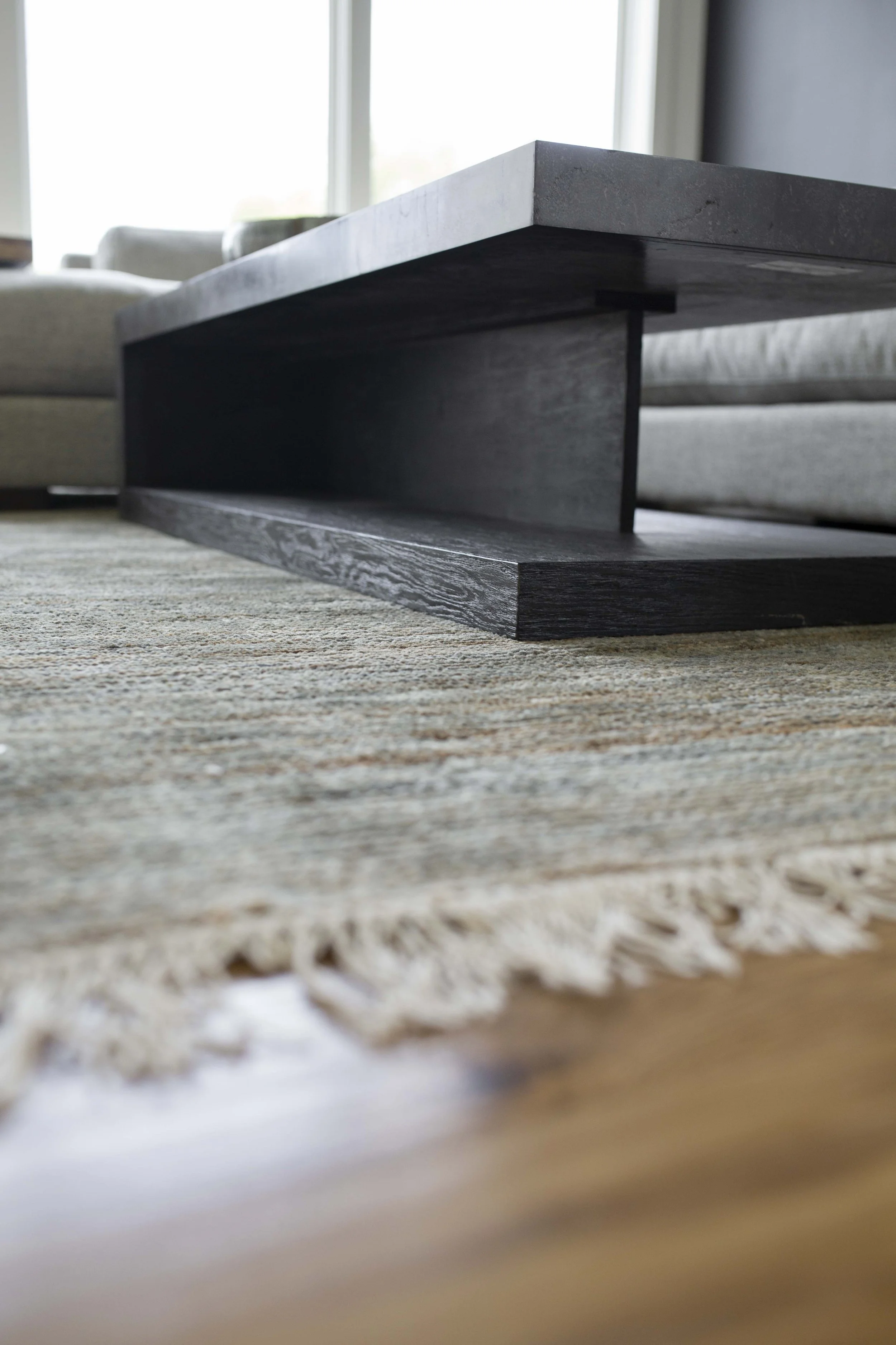 We had a lot of fun adding texture with furnishings and accessories in this space. You can see the beautiful rug has monochromatic detailing, with a just right comfort that does not overpower the space, but complements the black accent wall perfectly.
