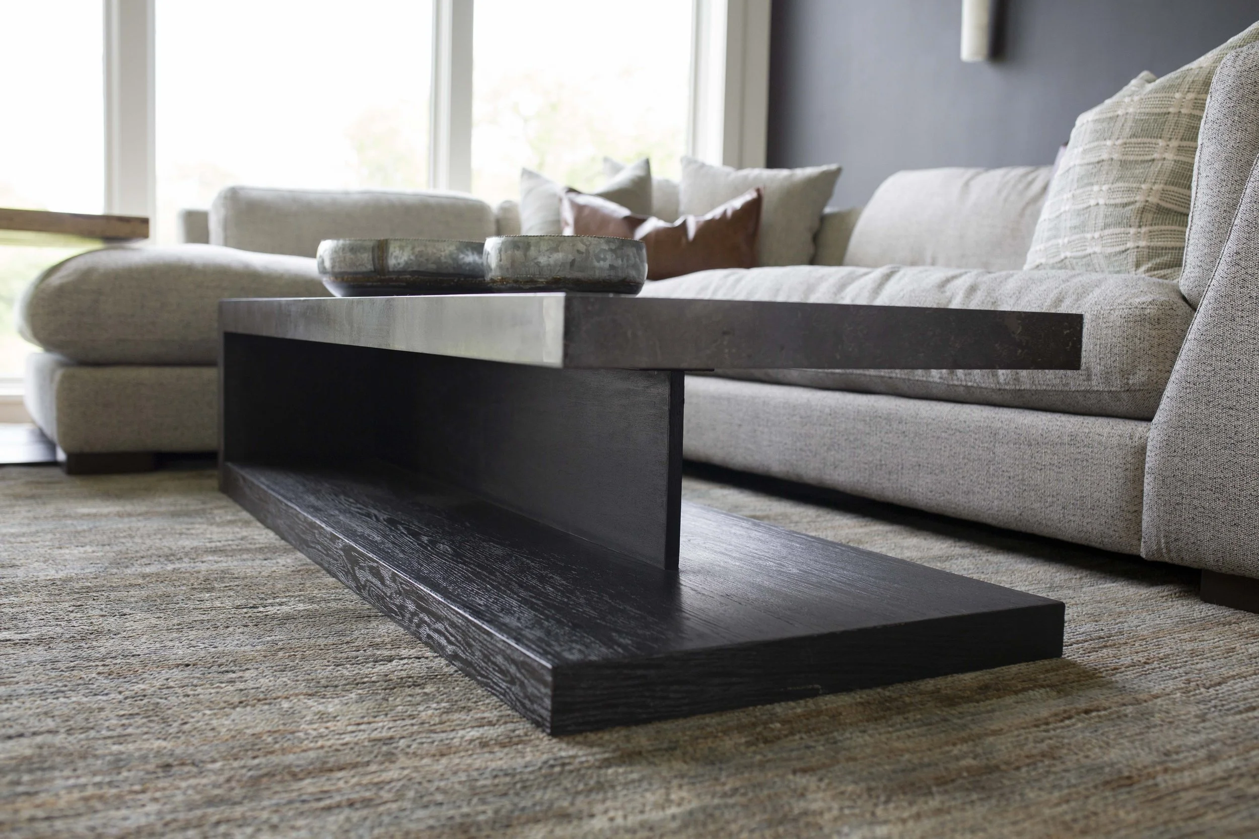 We love how the elongated coffee table really complements this L shaped sectional that lends itself to a functional and well designed space that people can truly have comfort in and make it a useful space for entertaining as well.