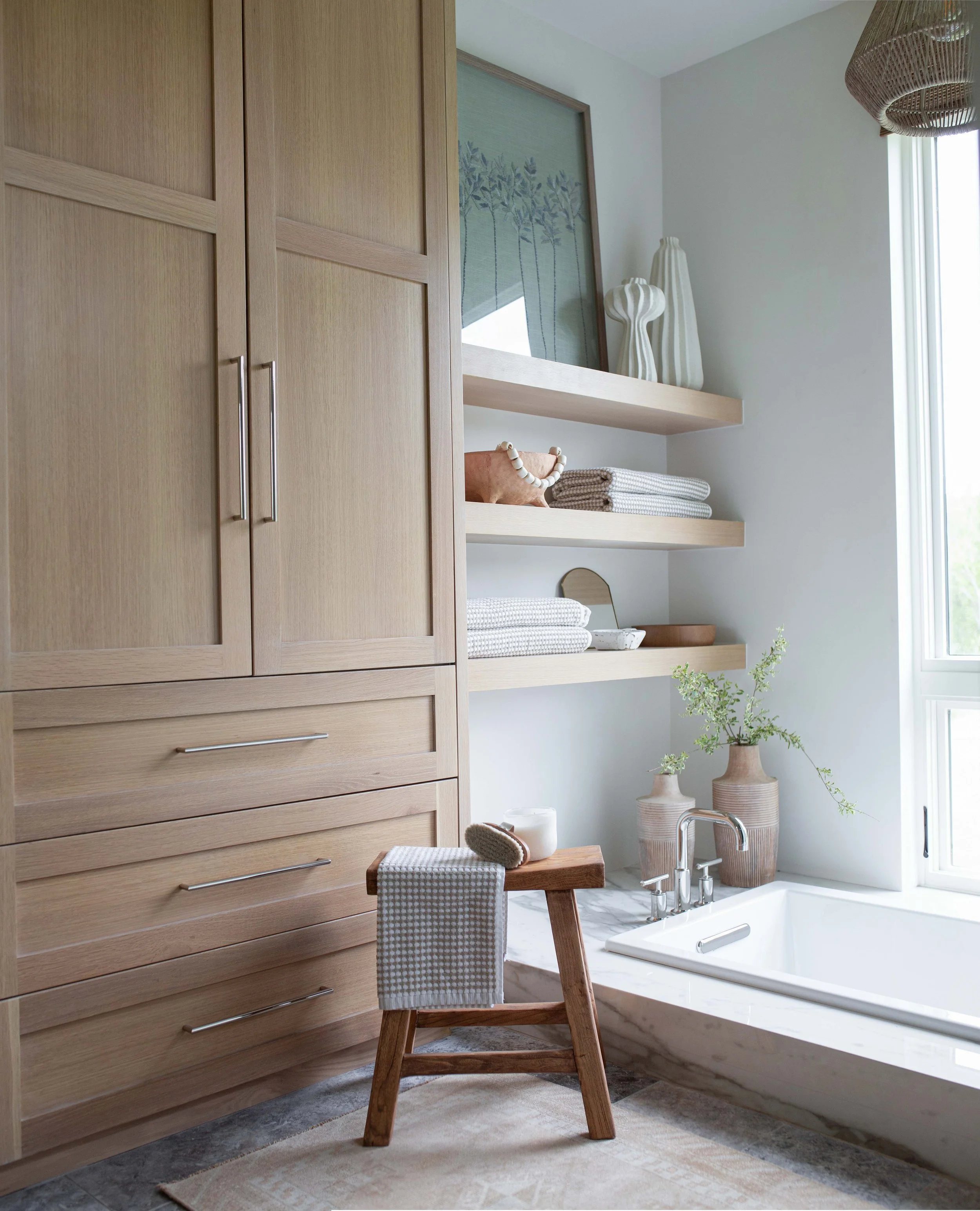 We love the sunken tub, it’s such a fun and unique feature in this primary bath! We continued with the same porcelain slab around the tub and extended the light oak into the space for the cabinet and shelves. The rugs bring all the colors and warm tones together and add the perfect vintage touch.