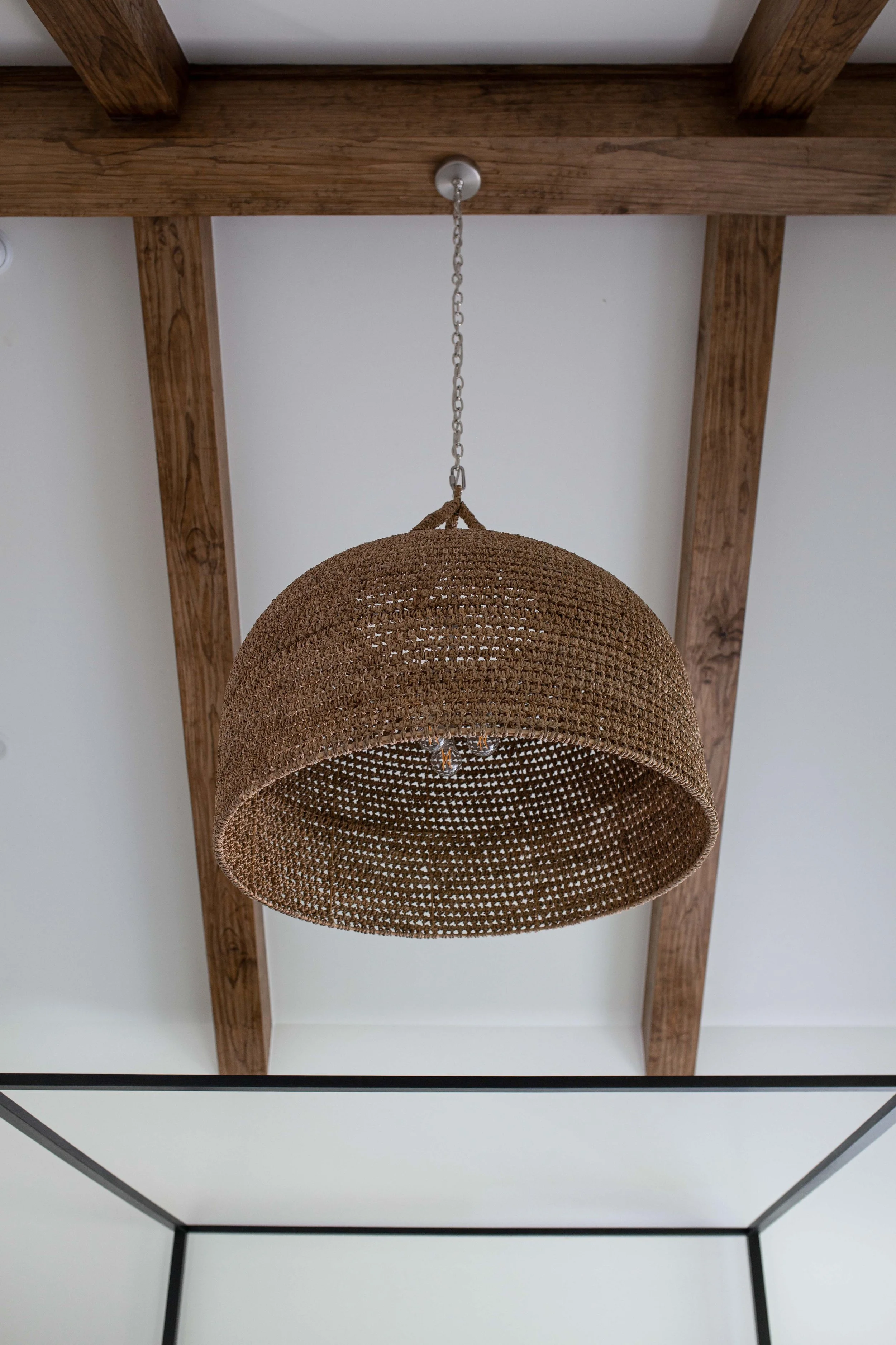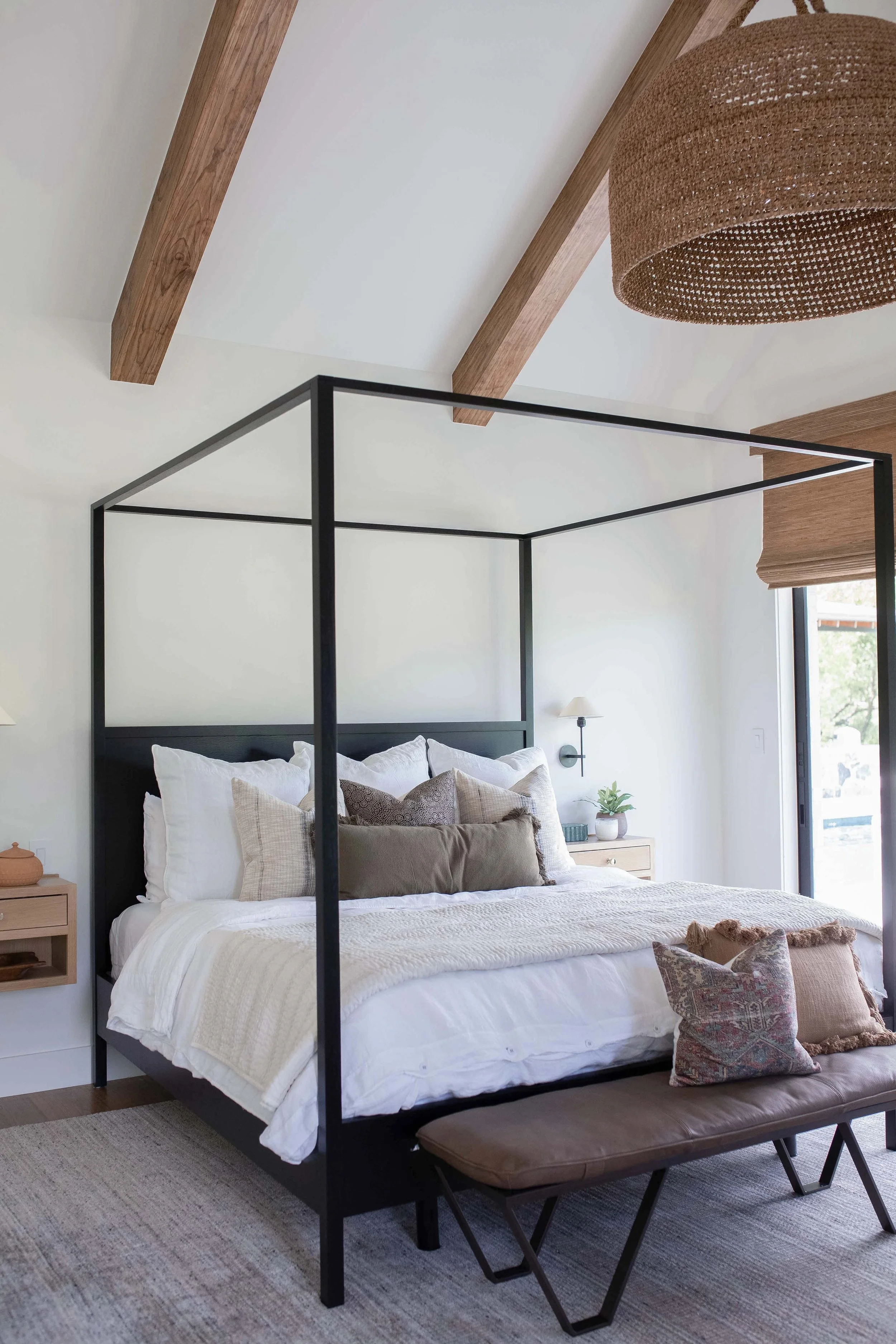 The dark wood beams and the woven pendant are a perfect combo! We love using natural textures, especially in bedrooms. One of our most frequently asked questions is about wood stain. Because we mix custom stains on the construction site, we’re able to get the perfect color, often matching another element in the space, like this light fixture.